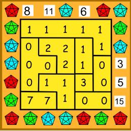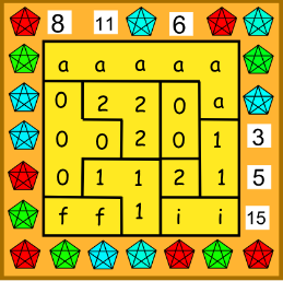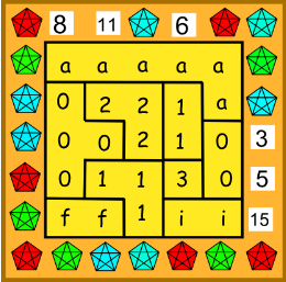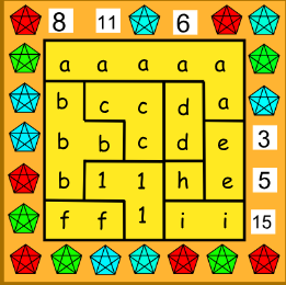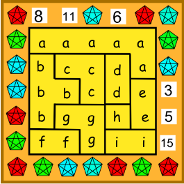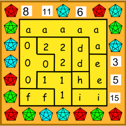 Pravý náhrdelník má tvar štvorca 5 \times 5 rozdeleného na niekoľko nepravidelných oblastí. V každom políčku je vsadených nejaký počet drahokamov (nezáporné celé číslo), pričom políčka, ktoré sú v rovnakej oblasti, majú v sebe rovnaký počet drahokamov. Čísla na boku udávajú celkový počet drahokamov v danom riadku alebo stĺpci. Aké počty drahokamov mohli byť v jednotlivých políčkach? Nájdite všetky možnosti.