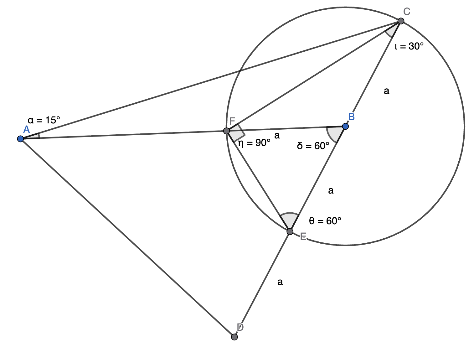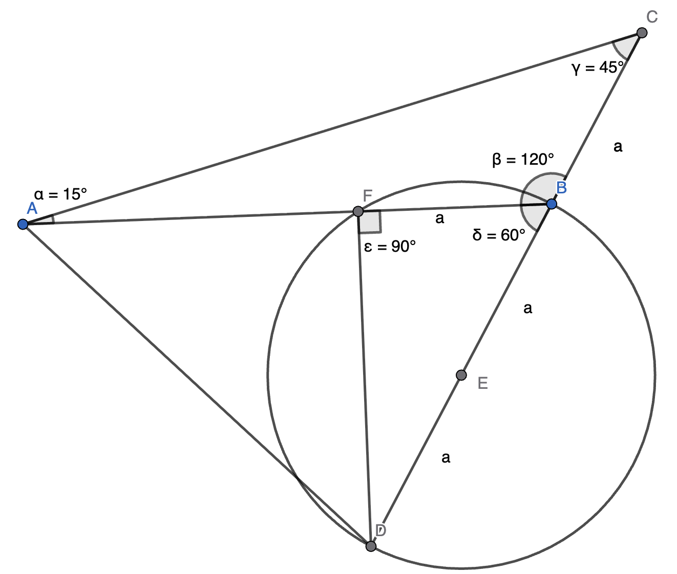 Ako prvé si spravme obrázok a doznačme si stred BD ako E a nech |BC|=a. Ďalej vieme dorátať uhol \angle ABC, keďže súčet uhlov v trojuhoľníku je 180^\circ, teda |\angle ABC|=180^\circ - 15^\circ - 45^\circ=120^\circ