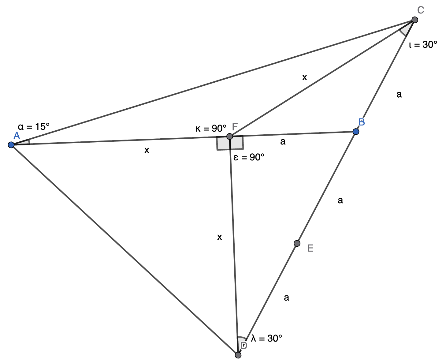 Ďalej môžeme dorátať pár uhlov: |\angle BCF|=180^\circ-|\angle CFE|-|\angle FEC|=180^\circ-90^\circ-60^\circ=30^\circ \\ |\angle FCA|=|\angle BCA|-|\angle BCF|=45^\circ-30^\circ=15^\circKeďže |\angle BCF|=|\angle CAB|, tak je \triangle CAF rovnoramenný, a teda |CF|=|AF|. Ale \triangle CEF, \triangle DBF sú zhodné, a teda aj |FD|=|CF|=|AF|. Z tohto dostávame, že aj, že \triangle ADF je rovnoramenný, s pravým uhlom pri vrchole F.