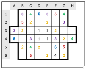 Teraz sa pozrime na G2. K budove na tomto políčku treba nájsť ešte jednu. Z možných políčok, D2 a E3 sú príliš blízko k trojke na E1. Teda jediné možné políčko je F4.