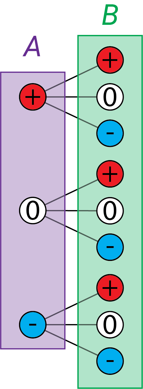 Takže pre vrtuľu s pohonom A sú tri možnosti ako vie ísť. Pre každú z týchto možností existujú tri možnosti ako vieme zapojiť vrtuľu B. Toto si vieme pekne ilustrovať na tomto obrázku: