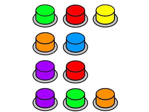 Na obrázku je znázornených 10 gombíkov, z ktorých práve jeden je záchranný. Lukáš iba vie, v ktorom riadku sa gombík nachádza, a Alex pozná jeho farbu ale nič iné.